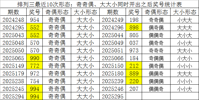 排列三最近10次同时开出奇偶形态:奇奇偶和大小形态:大大小时其奖号分别为:954-552-552-570-570-990-772-972-754-994-994,下期分别开出号码为:198-898-805-037-973-184-212-889-220-207,详细统计见下表: