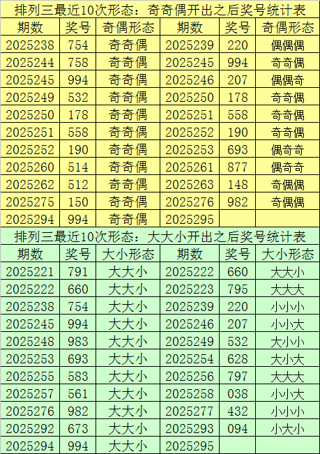 开奖回顾:体彩排列三第2025294期开出奖号:994。奖号基本特征为:
