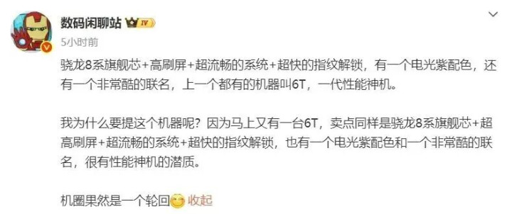 还有消息提到过,某厂新机搭载骁龙 8 系旗舰芯、超高刷屏、超流畅的系统、超快的指纹解锁,拥有电光紫配色和一个非常酷的联名。