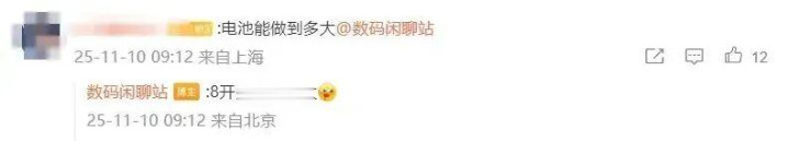 与此同时,有网友询问“明年大家都上1万电池了是不是都歇一歇了?还是往12000冲”,这位博主的回复显示“谁敢歇,接着卷,只是增速变缓”,还提到“现在感觉用户对充电时间没那么敏感了,大电池充满普遍都是一小时,所以路线就是加电池”。